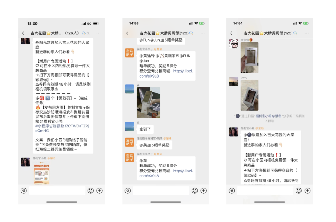 柜機(jī)落地后,海購格子還安排工作人員在吉大花園開展免費(fèi)送精美大牌香水小樣一份,及其他精美禮品的活動(dòng),幫助阮先生社群引流助力。